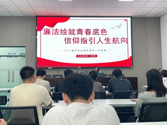 为进一步强化毕业生党员的廉洁意识与使命担当,筑牢廉洁自律思想防线,扣好廉洁从业“第一粒扣子”,2025年5月27日下午,机械工程学院党委书记刘英慧以“廉洁绘就青春底色 信仰指引人生航向”为题,为2025届毕业生党员讲授离校前最后一堂党课,引导毕业生党员在新的人生征程中坚守初心使命,勇担时代重任。